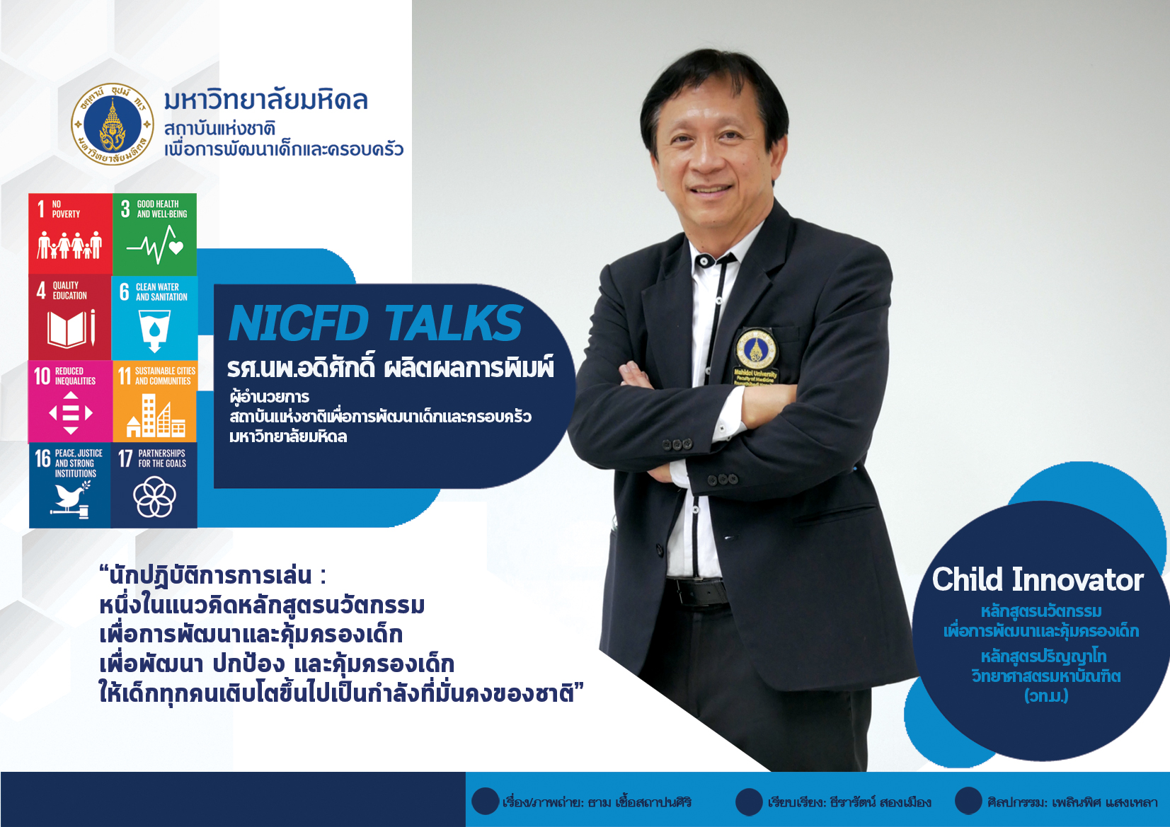 A: หลักสูตรนวัตกรรมเพื่อการพัฒนาและคุ้มครองเด็กตอบโจทย์ภารกิจของสถาบันเด็กฯ ม.มหิดล อยู่ 3 ด้าน ดังนี้ (1) “ด้านการวิจัยและการคิดค้นนวัตกรรม” เพื่อให้เกิดการพัฒนาและคุ้มครองเด็กให้เท่าทันการเปลี่ยนแปลงของโลก ให้ได้ตามยุทธศาสตร์ชาติ และให้ได้ตามวาระการพัฒนาที่ยั่งยืน ค.ศ. 2030 (The 2030 Agenda for Sustainable Development) (2) “ด้านการศึกษา” สถาบันฯ มุ่งเน้นการเรียนรู้ของเด็กและผู้ใหญ่ โดยสถาบันฯ ได้เน้นในเรื่องของการเรียนรู้ต่อเนื่องตลอดชีวิต เพื่อให้เด็กและผู้ใหญ่มีความรู้ในเรื่องของการพัฒนาเด็กและครอบครัวอย่างต่อเนื่องทุกกลุ่มช่วงวัย และ (3) “ด้านการชี้นำสังคมและผลักดันนโยบาย” โดยหลักสูตรนี้จะเป็นฐานของทั้งการสร้างกำลังคน การผลิตเนื้อหา เพื่อนำไปสู่นโยบายของประเทศของต่อไป