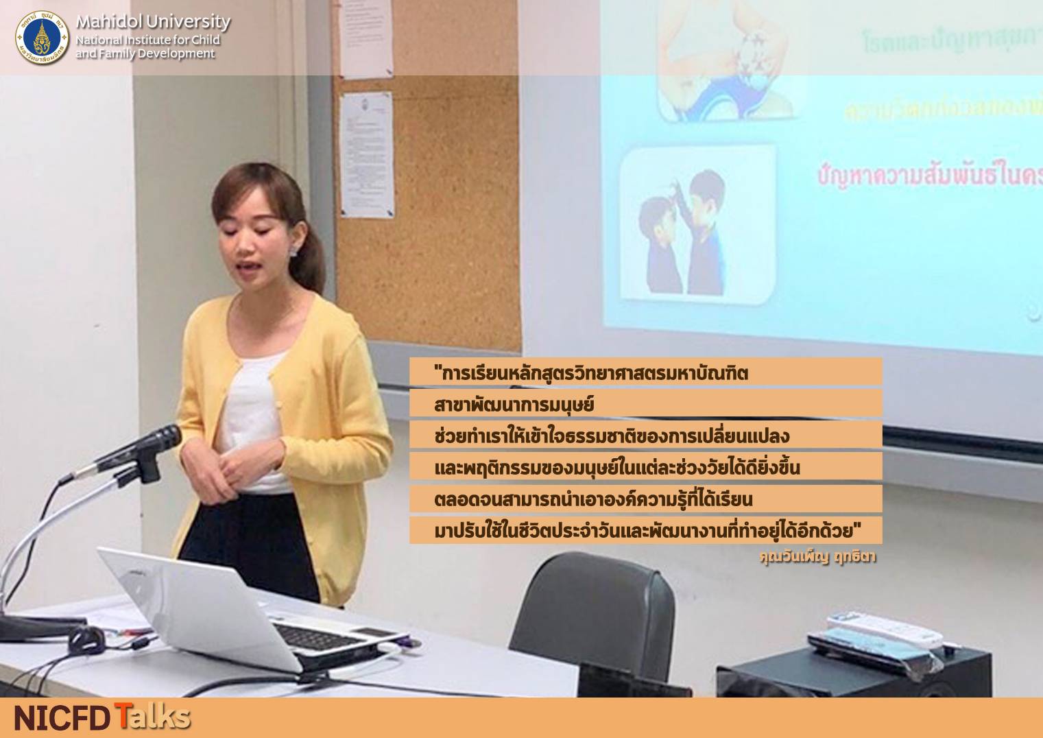 คุณพลอยบอกว่า “แรงบันดาลใจในการเรียนหลักสูตรนี้ของพลอยคือ การทำงานกับเด็ก โดยเฉพาะอย่างยิ่งเด็กที่มาเข้ารับบริการ อยากนำความรู้ที่ได้มาช่วยเหลือเด็กและครอบครัวให้มากขึ้น ซึ่งการที่ได้เห็นความแตกต่างของเด็กและครอบครัวนั้นมีความแตกต่างกันออกไป จึงทำให้เด็กมีพัฒนาการทั้งด้านร่างกาย ภาษา ความคิดและอารมณ์สังคมที่แตกต่างกัน จึงอยากทำความเข้าใจศึกษาเกี่ยวกับปัจจัยแวดล้อมรอบตัวเด็ก แนวทางการเลี้ยงดูเด็กโดยเฉพาะการเลี้ยงดูเชิงบวกมากขึ้น เพื่อจะได้นำมาปรับใช้กับงานในการดูแลช่วยเหลือเด็กต่อไป”